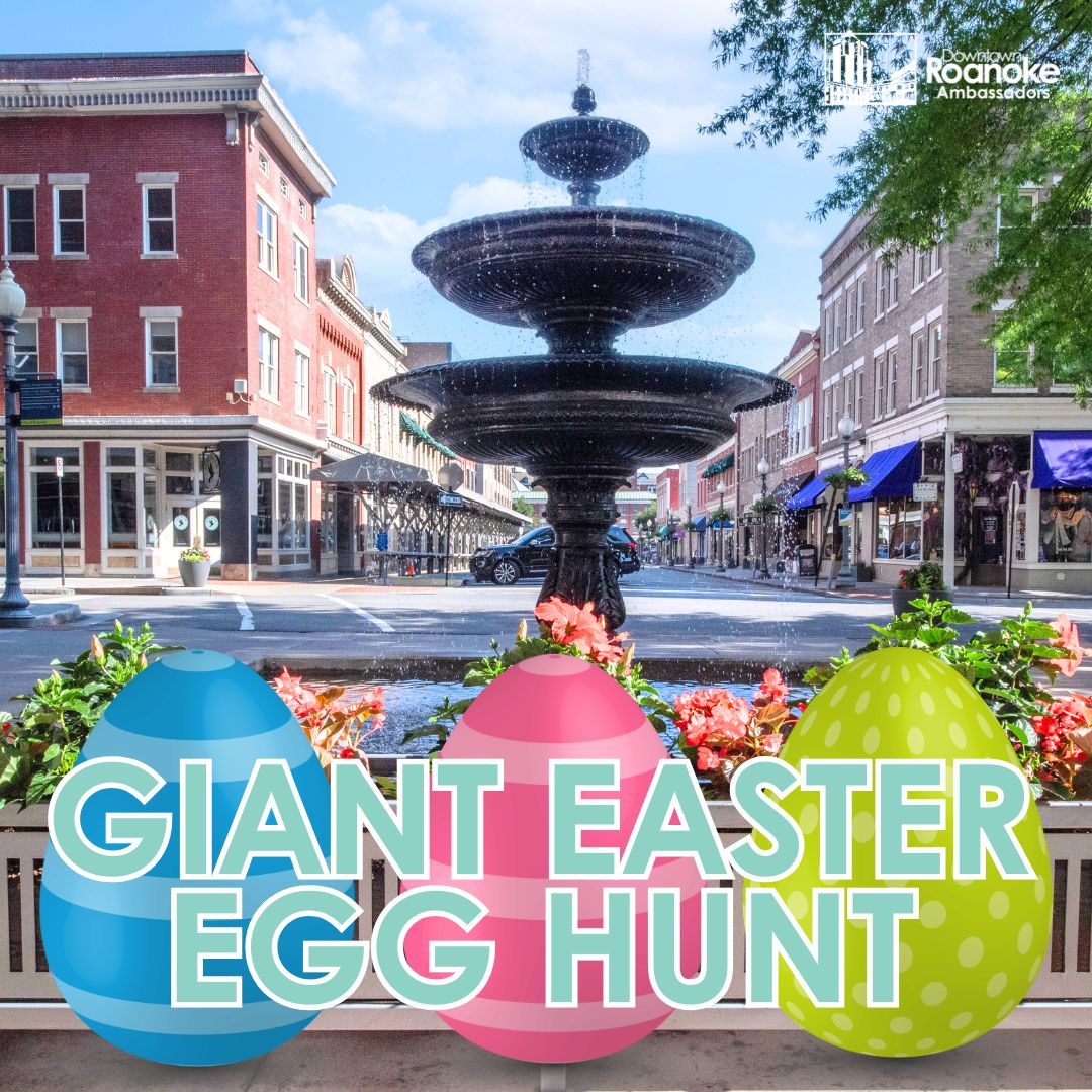 The Downtown Roanoke Ambassador team will be hosting a small Easter egg hunt on Friday, April 3rd starting at 9:00 am. There will be only 8 large eggs hidden throughout the downtown district, filled with sweet treats and gift cards to Downtown Roanoke businesses! | ![]() |